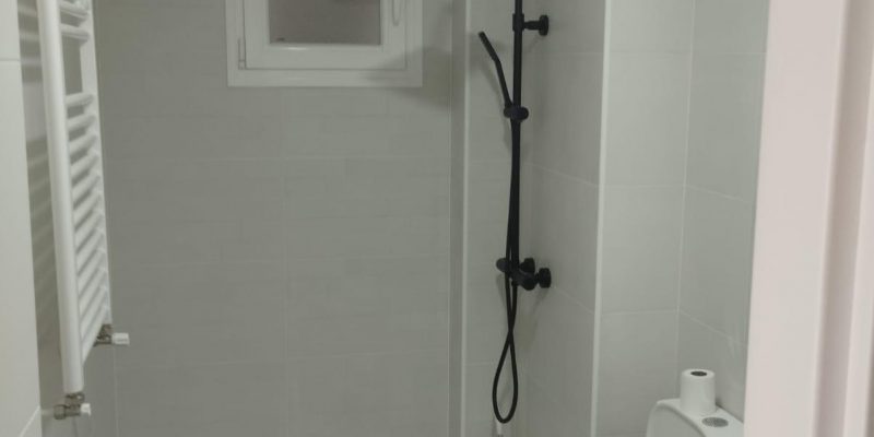 Baño recién reformado con plato de ducha Roca en negro y suelo antracita.